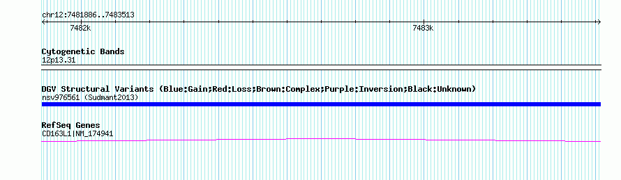 Variant DetailsVariant: nsv976561| Internal ID | 18611767 | | Landmark | | | Location Information | | | Cytoband | 12p13.31 | | Allele length | | Assembly | Allele length | | hg38 | 1628 | | hg19 | 1628 | | hg18 | 1628 |
