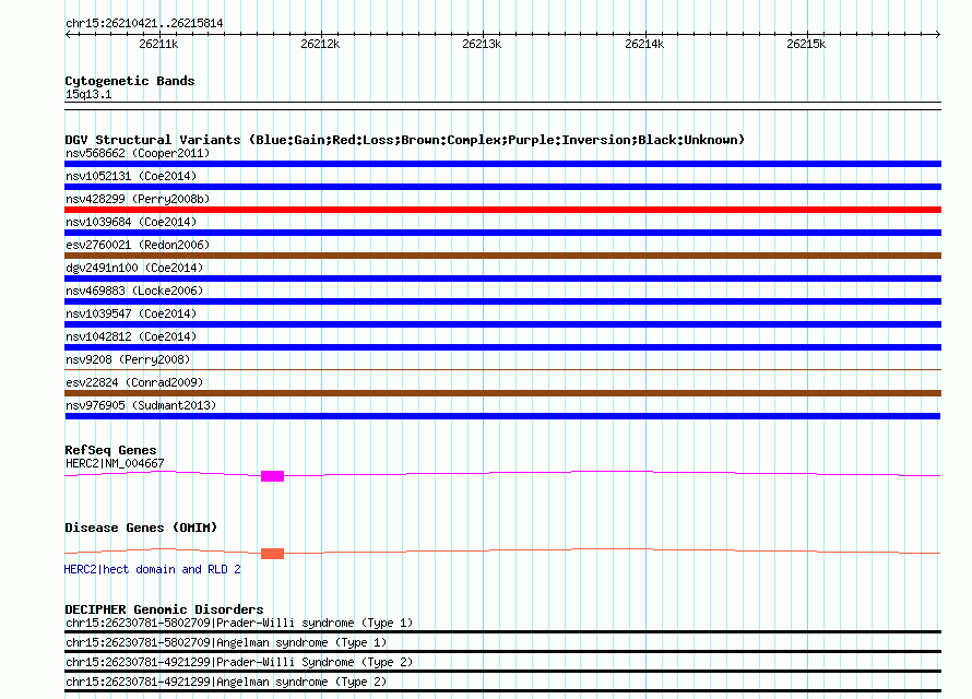 | | Variant Type | CNV duplication | | Copy Number | | | Allele State | | | Allele Origin | | | Probe Count | | | Validation Flag | | | Merged Status | M | | Merged Variants | | | Supporting Variants | nssv2011422, nssv2011427, nssv2011431, nssv2011428, nssv2011423, nssv2011425, nssv2011429, nssv2011426, nssv2011424, nssv2011430 | | Samples | HGDP01284, HGDP00665, HGDP00998, HGDP00521, HGDP00778, HGDP01307, HGDP00542, HGDP01029, HGDP00456, HGDP00927 | | Known Genes | HERC2 | | Method | Sequencing | | Analysis | lineage specific fixed duplications | | Platform | Not reported | | Comments | | | Reference | Sudmant_et_al_2013 | | Pubmed ID | 23825009 | | Accession Number(s) | nsv976905