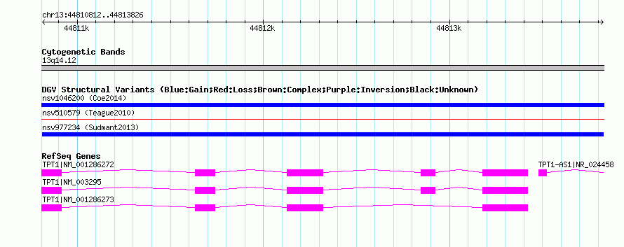 Variant DetailsVariant: nsv977234| Internal ID | 18612440 | | Landmark | | | Location Information | | | Cytoband | 13q14.12 | | Allele length | | Assembly | Allele length | | hg38 | 3015 | | hg19 | 3015 | | hg18 | 3015 |
