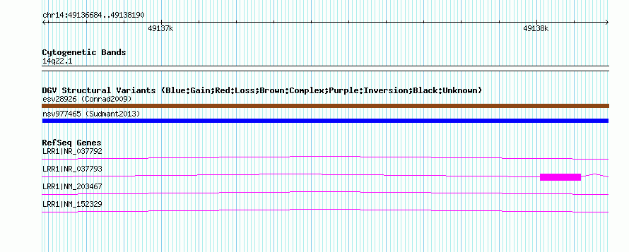 Variant DetailsVariant: nsv977465| Internal ID | 18612671 | | Landmark | | | Location Information | | | Cytoband | 14q21.3 | | Allele length | | Assembly | Allele length | | hg38 | 1507 | | hg19 | 1507 | | hg18 | 1507 |