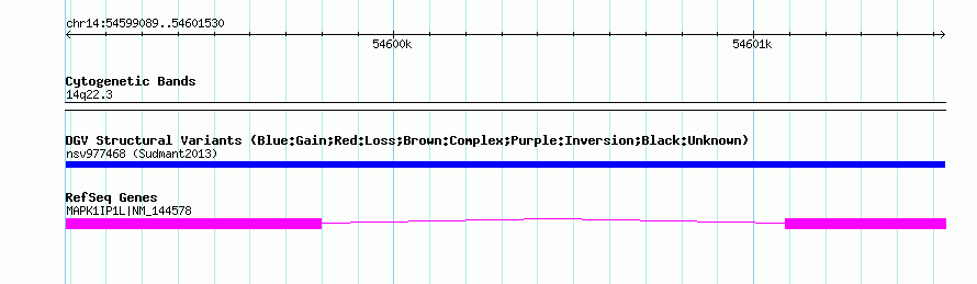 | | Variant Type | CNV duplication | | Copy Number | | | Allele State | | | Allele Origin | | | Probe Count | | | Validation Flag | | | Merged Status | M | | Merged Variants | | | Supporting Variants | nssv1988216, nssv1988220, nssv1988215, nssv1988214, nssv1988219, nssv1988223, nssv1988221, nssv1988218, nssv1988222, nssv1988217 | | Samples | HGDP01284, HGDP00665, HGDP00998, HGDP00521, HGDP00778, HGDP01307, HGDP00542, HGDP01029, HGDP00456, HGDP00927 | | Known Genes | MAPK1IP1L | | Method | Sequencing | | Analysis | lineage specific fixed duplications | | Platform | Not reported | | Comments | | | Reference | Sudmant_et_al_2013 | | Pubmed ID | 23825009 | | Accession Number(s) | nsv977468