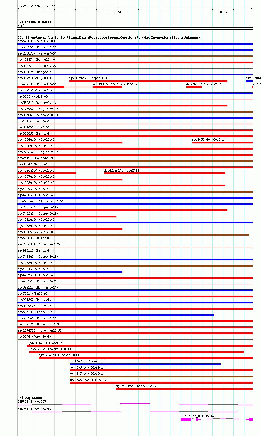 | | Variant Type | CNV gain+loss | | Copy Number | | | Allele State | | | Allele Origin | | | Probe Count | | | Validation Flag | | | Merged Status | M | | Merged Variants | | | Supporting Variants | nssv22579, nssv24994, nssv24080, nssv26069, nssv25200, nssv27666, nssv24745, nssv25564, nssv27887, nssv24728, nssv21875, nssv24540, nssv27660, nssv28605, nssv24247, nssv25908, nssv26834, nssv26429, nssv25555, nssv25426, nssv27098 | | Samples | NA18502, NA11830, NA07029, NA12155, NA18563, NA18860, NA18942, NA07048, NA18975, NA19007, NA10847, NA10863, NA18572, NA19221, NA18537, NA18517, NA18564, NA19240, NA19144, NA19173, NA18552 | | Known Genes | SIRPB1 | | Method | Oligo aCGH | | Analysis | Statistical threshold = 5.0, minimum +/- log2 ratio = 0.25 and minimum number of probes = 2 | | Platform | Agilent-015686 Custom Human 244K CGH Microarray | | Comments | | | Reference | Perry_et_al_2008 | | Pubmed ID | 18304495 | | Accession Number(s) | nsv9776