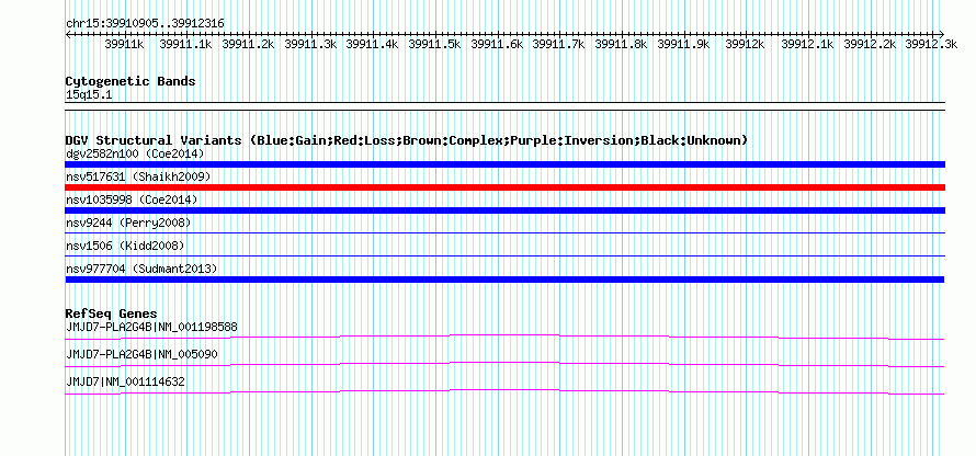 | Variant Type | CNV duplication | Copy Number | | Allele State | | Allele Origin | | Probe Count | | Validation Flag | | Merged Status | M | Merged Variants | | Supporting Variants | nssv2020179, nssv2020184, nssv2020182, nssv2020186, nssv2020187, nssv2020180, nssv2020181, nssv2020183, nssv2020185, nssv2020178 | Samples | HGDP01284, HGDP00665, HGDP00998, HGDP00521, HGDP00778, HGDP01307, HGDP00542, HGDP01029, HGDP00456, HGDP00927 | Known Genes | JMJD7, JMJD7-PLA2G4B | Method | Sequencing | Analysis | lineage specific fixed duplications | Platform | Not reported | Comments | | Reference | Sudmant_et_al_2013 | Pubmed ID | 23825009 | Accession Number(s) | nsv977704
