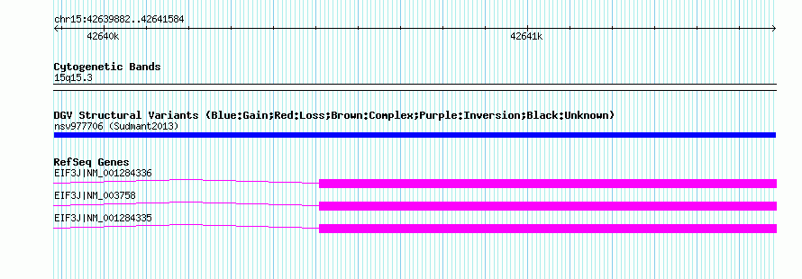 Variant DetailsVariant: nsv977706| Internal ID | 18612912 | | Landmark | | | Location Information | | | Cytoband | 15q15.3 | | Allele length | | Assembly | Allele length | | hg38 | 1703 | | hg19 | 1703 | | hg18 | 1703 |