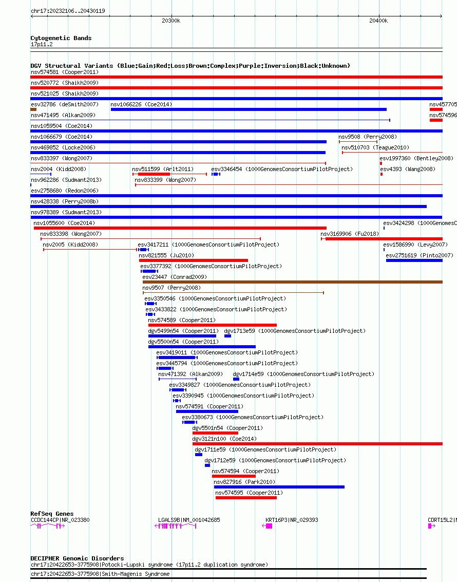 Variant DetailsVariant: nsv978389| Internal ID | 18613594 | | Landmark | | | Location Information | | | Cytoband | 17p11.2 | | Allele length | | Assembly | Allele length | | hg38 | 198014 | | hg19 | 198014 | | hg18 | 198014 |