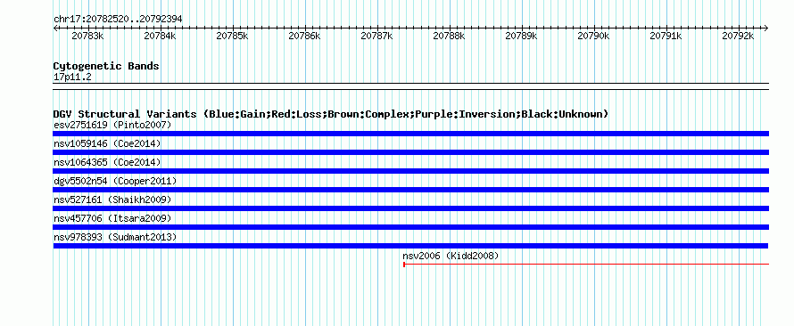 Variant DetailsVariant: nsv978393| Internal ID | 18613598 | | Landmark | | | Location Information | | | Cytoband | 17p11.2 | | Allele length | | Assembly | Allele length | | hg38 | 9875 | | hg19 | 9875 | | hg18 | 9875 |