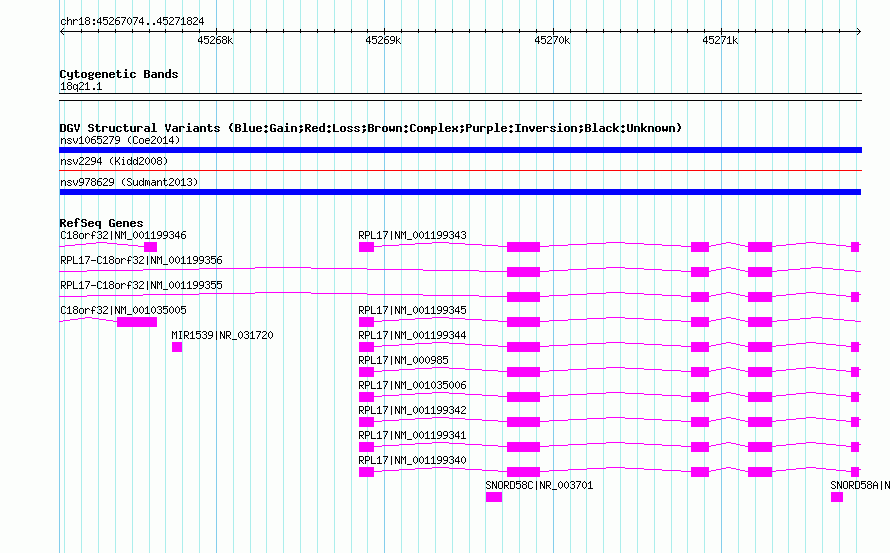 Variant DetailsVariant: nsv978629| Internal ID | 18613832 | | Landmark | | | Location Information | | | Cytoband | 18q21.1 | | Allele length | | Assembly | Allele length | | hg38 | 4751 | | hg19 | 4751 | | hg18 | 4751 |