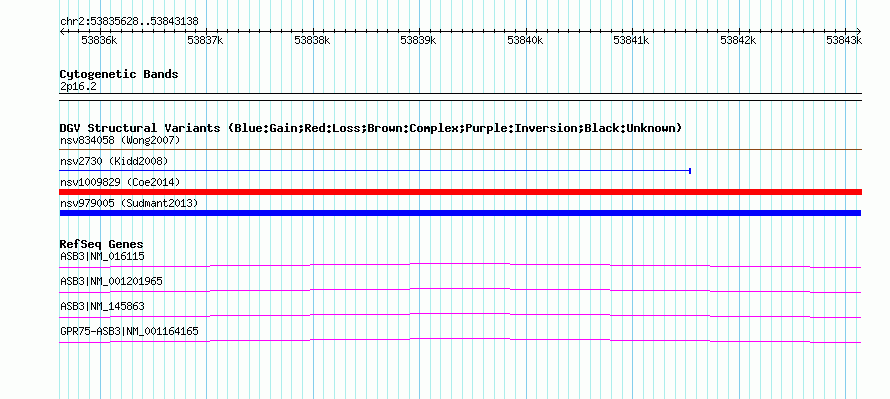 Variant DetailsVariant: nsv979005| Internal ID | 18614208 | | Landmark | | | Location Information | | | Cytoband | 2p16.2 | | Allele length | | Assembly | Allele length | | hg38 | 7511 | | hg19 | 7511 | | hg18 | 7511 |