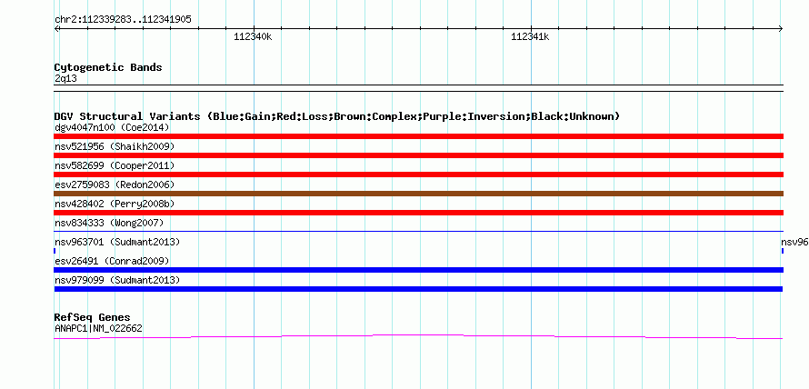 Variant DetailsVariant: nsv979099| Internal ID | 18614302 | | Landmark | | | Location Information | | | Cytoband | 2q13 | | Allele length | | Assembly | Allele length | | hg38 | 2623 | | hg19 | 2623 | | hg18 | 2623 |