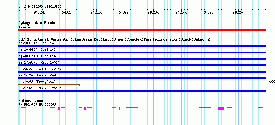 Variant DetailsVariant: nsv979229| Internal ID | 18614432 | | Landmark | | | Location Information | | | Cytoband | 2q11.1 | | Allele length | | Assembly | Allele length | | hg38 | 8701 | | hg19 | 8701 | | hg18 | 8701 |