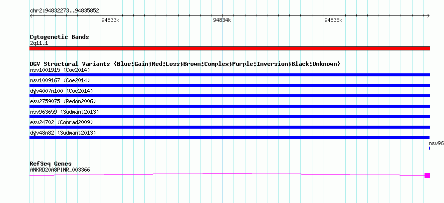 Variant DetailsVariant: nsv979230| Internal ID | 18614433 | | Landmark | | | Location Information | | | Cytoband | 2q11.1 | | Allele length | | Assembly | Allele length | | hg38 | 3580 | | hg19 | 3580 | | hg18 | 3580 |