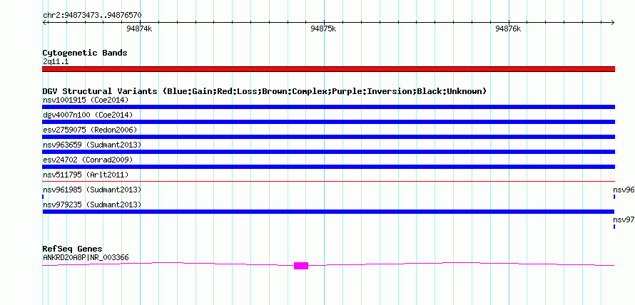 Variant DetailsVariant: nsv979235| Internal ID | 18614438 | | Landmark | | | Location Information | | | Cytoband | 2q11.1 | | Allele length | | Assembly | Allele length | | hg38 | 3098 | | hg19 | 3098 | | hg18 | 3098 |