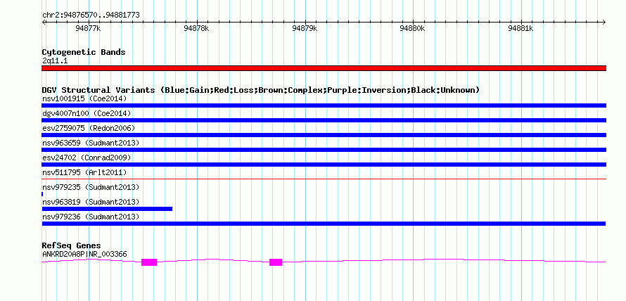 Variant DetailsVariant: nsv979236| Internal ID | 18614439 | | Landmark | | | Location Information | | | Cytoband | 2q11.1 | | Allele length | | Assembly | Allele length | | hg38 | 5204 | | hg19 | 5204 | | hg18 | 5204 |