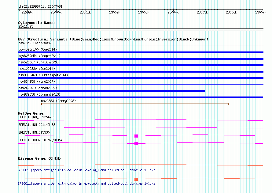 Variant DetailsVariant: nsv979658| Internal ID | 18614859 | | Landmark | | | Location Information | | | Cytoband | 22q11.23 | | Allele length | | Assembly | Allele length | | hg38 | 8361 | | hg19 | 8361 | | hg18 | 8361 |