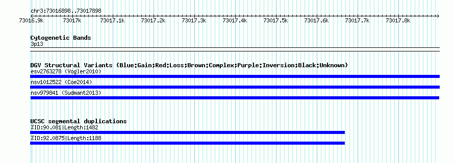 Variant DetailsVariant: nsv979841| Internal ID | 18268356 | | Landmark | | | Location Information | | | Cytoband | 3p13 | | Allele length | | Assembly | Allele length | | hg38 | 1001 | | hg19 | 1001 | | hg18 | 1001 |