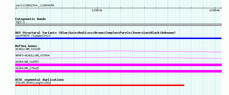 | | Variant Type | CNV duplication | | Copy Number | | | Allele State | | | Allele Origin | | | Probe Count | | | Validation Flag | | | Merged Status | M | | Merged Variants | | | Supporting Variants | nssv2293933, nssv2293937, nssv2293930, nssv2293928, nssv2293934, nssv2293936, nssv2293931, nssv2293929, nssv2293935, nssv2293932 | | Samples | HGDP01284, HGDP00665, HGDP00998, HGDP00521, HGDP00778, HGDP01307, HGDP00542, HGDP01029, HGDP00456, HGDP00927 | | Known Genes | ACAD11, ACKR4, NPHP3-ACAD11 | | Method | Sequencing | | Analysis | lineage specific fixed duplications | | Platform | Not reported | | Comments | | | Reference | Sudmant_et_al_2013 | | Pubmed ID | 23825009 | | Accession Number(s) | nsv979879