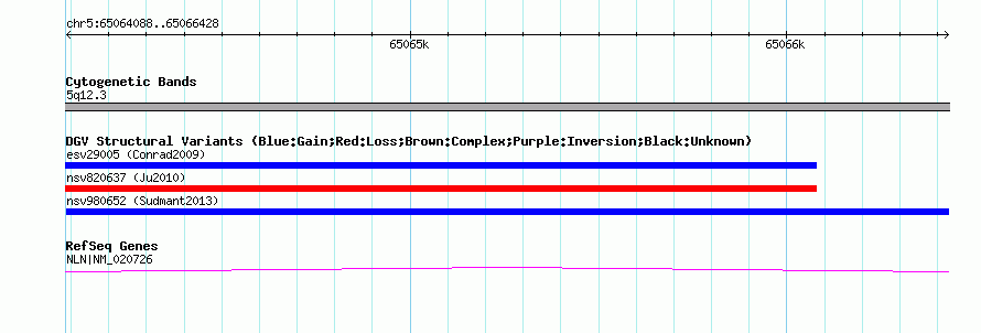 Variant DetailsVariant: nsv980652| Internal ID | 18615852 | | Landmark | | | Location Information | | | Cytoband | 5q12.3 | | Allele length | | Assembly | Allele length | | hg38 | 2341 | | hg19 | 2341 | | hg18 | 2341 |