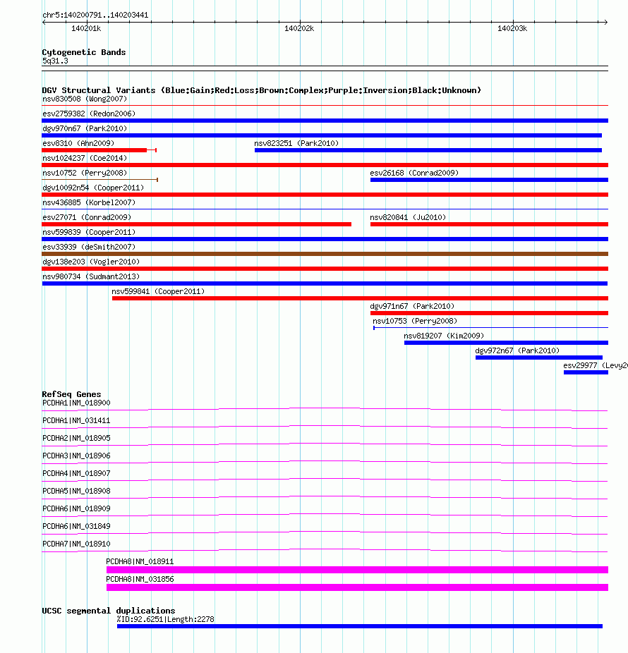 | | Variant Type | CNV duplication | | Copy Number | | | Allele State | | | Allele Origin | | | Probe Count | | | Validation Flag | | | Merged Status | M | | Merged Variants | | | Supporting Variants | nssv2379515, nssv2379510, nssv2379516, nssv2379511, nssv2379513, nssv2379509, nssv2379512, nssv2379514, nssv2379517, nssv2379508 | | Samples | HGDP01284, HGDP00665, HGDP00998, HGDP00521, HGDP00778, HGDP01307, HGDP00542, HGDP01029, HGDP00456, HGDP00927 | | Known Genes | PCDHA1, PCDHA2, PCDHA3, PCDHA4, PCDHA5, PCDHA6, PCDHA7, PCDHA8 | | Method | Sequencing | | Analysis | lineage specific fixed duplications | | Platform | Not reported | | Comments | | | Reference | Sudmant_et_al_2013 | | Pubmed ID | 23825009 | | Accession Number(s) | nsv980734