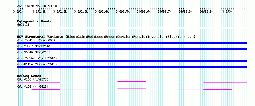 Variant DetailsVariant: nsv981134| Internal ID | 18616333 | | Landmark | | | Location Information | | | Cytoband | 6p21.31 | | Allele length | | Assembly | Allele length | | hg38 | 1096 | | hg19 | 1096 | | hg18 | 1096 |