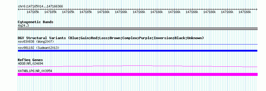 Variant DetailsVariant: nsv981192| Internal ID | 18616391 | | Landmark | | | Location Information | | | Cytoband | 6q24.3 | | Allele length | | Assembly | Allele length | | hg38 | 1353 | | hg19 | 1353 | | hg18 | 1353 |