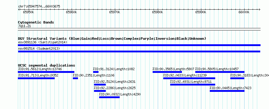 Variant DetailsVariant: nsv981514| Internal ID | 18270025 | | Landmark | | | Location Information | | | Cytoband | 7q11.21 | | Allele length | | Assembly | Allele length | | hg38 | 56102 | | hg19 | 56102 | | hg18 | 56102 |