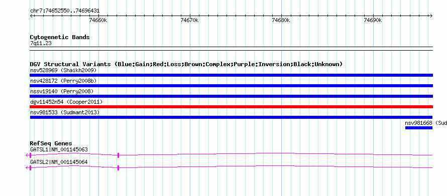 Variant DetailsVariant: nsv981533| Internal ID | 18616730 | | Landmark | | | Location Information | | | Cytoband | 7q11.23 | | Allele length | | Assembly | Allele length | | hg38 | 43817 | | hg19 | 43882 | | hg18 | 43882 |