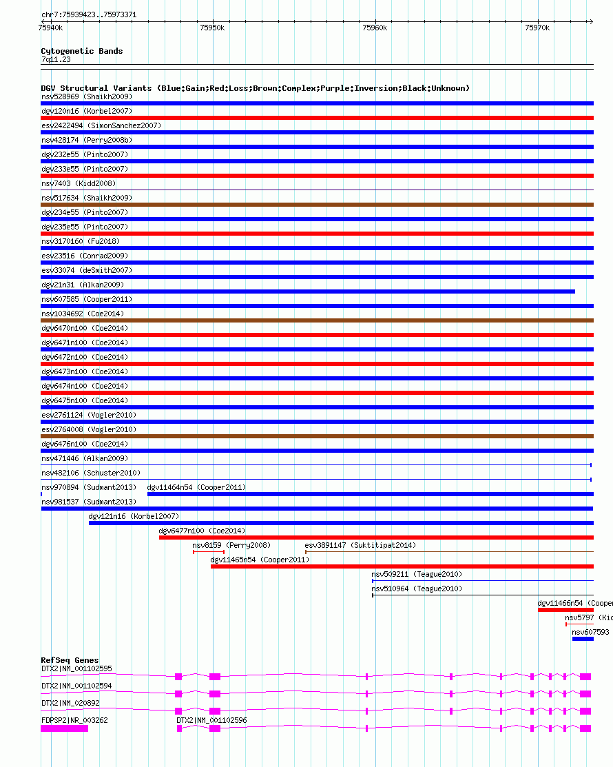 Variant DetailsVariant: nsv981537| Internal ID | 18616734 | | Landmark | | | Location Information | | | Cytoband | 7q11.23 | | Allele length | | Assembly | Allele length | | hg38 | 33949 | | hg19 | 33949 | | hg18 | 33949 |