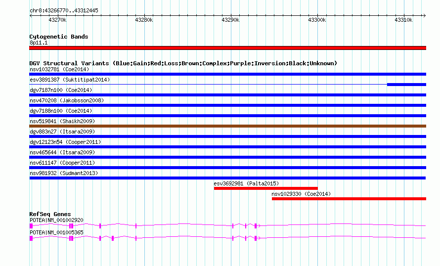 Variant DetailsVariant: nsv981932| Internal ID | 18617128 | | Landmark | | | Location Information | | | Cytoband | 8p11.1 | | Allele length | | Assembly | Allele length | | hg38 | 45676 | | hg19 | 45676 | | hg18 | 45676 |
