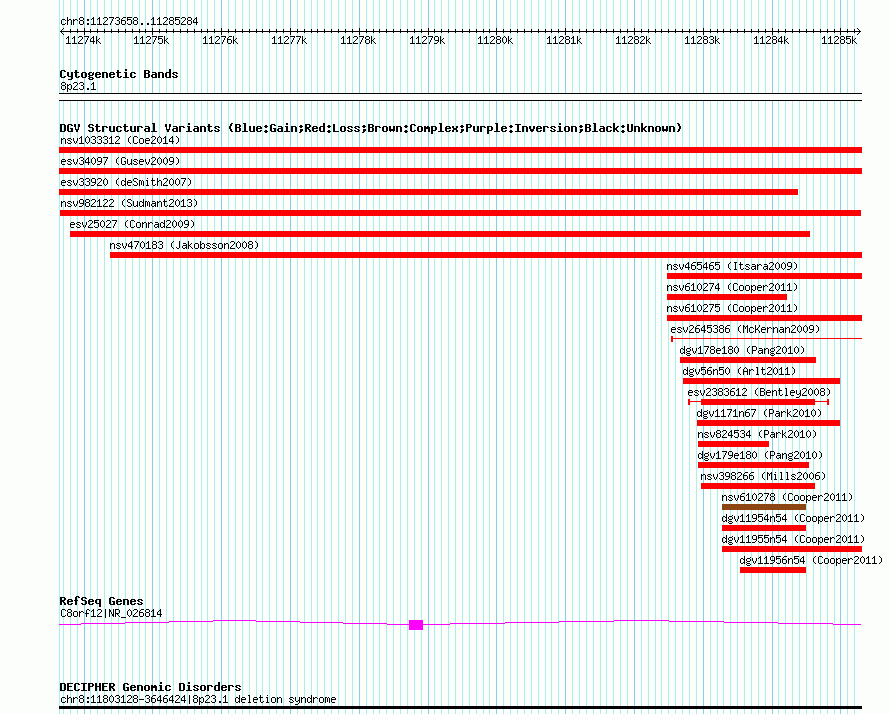 Variant DetailsVariant: nsv982122| Internal ID | 18617318 | | Landmark | | | Location Information | | | Cytoband | 8p23.1 | | Allele length | | Assembly | Allele length | | hg38 | 11627 | | hg19 | 11627 | | hg18 | 11627 |