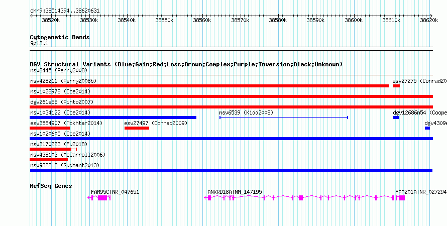 Variant DetailsVariant: nsv982218| Internal ID | 18617413 | | Landmark | | | Location Information | | | Cytoband | 9p13.1 | | Allele length | | Assembly | Allele length | | hg38 | 106238 | | hg19 | 106238 | | hg18 | 106238 |