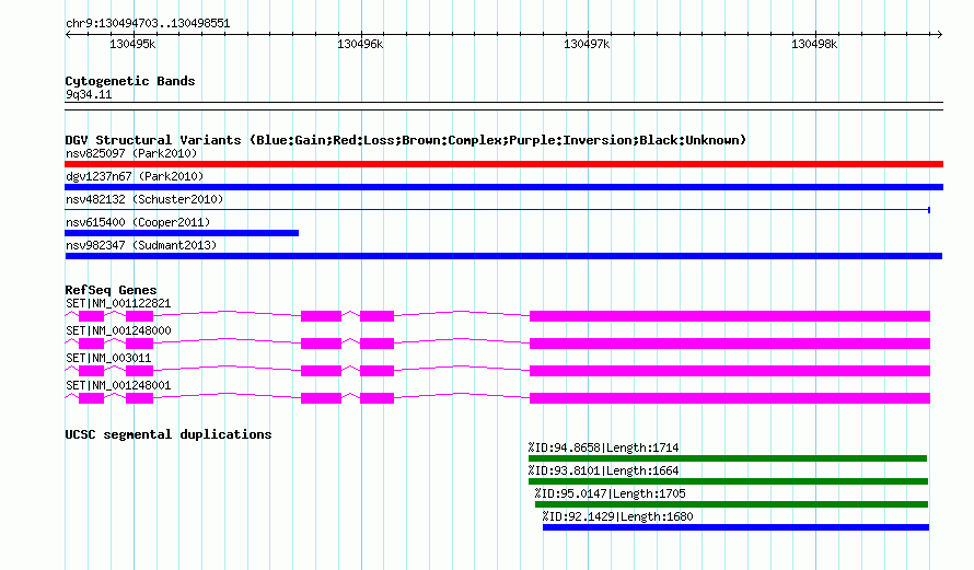 | Variant Type | CNV duplication | Copy Number | | Allele State | | Allele Origin | | Probe Count | | Validation Flag | | Merged Status | M | Merged Variants | | Supporting Variants | nssv2568639, nssv2568637, nssv2568638, nssv2568642, nssv2568644, nssv2568645, nssv2568641, nssv2568640, nssv2568643, nssv2568646 | Samples | HGDP01284, HGDP00665, HGDP00998, HGDP00521, HGDP00778, HGDP01307, HGDP00542, HGDP01029, HGDP00456, HGDP00927 | Known Genes | SET | Method | Sequencing | Analysis | lineage specific fixed duplications | Platform | Not reported | Comments | | Reference | Sudmant_et_al_2013 | Pubmed ID | 23825009 | Accession Number(s) | nsv982347