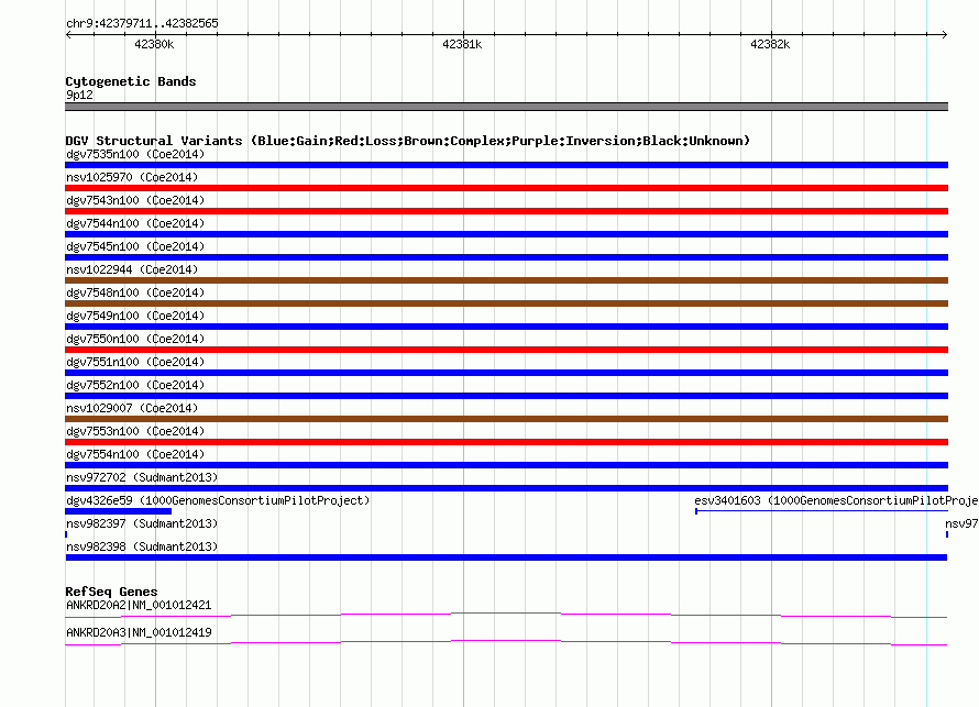 | | Variant Type | CNV duplication | | Copy Number | | | Allele State | | | Allele Origin | | | Probe Count | | | Validation Flag | | | Merged Status | M | | Merged Variants | | | Supporting Variants | nssv2727528, nssv2727527, nssv2727522, nssv2727520, nssv2727537, nssv2727603, nssv2727607, nssv2727523, nssv2727606, nssv2727535, nssv2727605, nssv2727526, nssv2727531, nssv2727540, nssv2727609, nssv2727601, nssv2727602, nssv2727604, nssv2727610, nssv2727532, nssv2727539, nssv2727534, nssv2727525, nssv2727533, nssv2727521, nssv2727529, nssv2727538, nssv2727608, nssv2727536, nssv2727524 | | Samples | HGDP01284, HGDP00665, HGDP00998, HGDP00521, HGDP00778, HGDP01307, HGDP00542, HGDP01029, HGDP00456, HGDP00927 | | Known Genes | ANKRD20A2, ANKRD20A3 | | Method | Sequencing | | Analysis | lineage specific fixed expansions | | Platform | Not reported | | Comments | | | Reference | Sudmant_et_al_2013 | | Pubmed ID | 23825009 | | Accession Number(s) | nsv982398