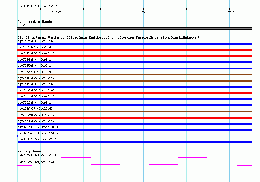 | | Variant Type | CNV duplication | | Copy Number | | | Allele State | | | Allele Origin | | | Probe Count | | | Validation Flag | | | Merged Status | M | | Merged Variants | dgv85n82 | | Supporting Variants | nssv2728542, nssv2728538, nssv2728539, nssv2728537, nssv2728536, nssv2728540, nssv2728535, nssv2728534, nssv2728541, nssv2728533 | | Samples | HGDP01284, HGDP00665, HGDP00998, HGDP00521, HGDP00778, HGDP01307, HGDP00542, HGDP01029, HGDP00456, HGDP00927 | | Known Genes | ANKRD20A2, ANKRD20A3 | | Method | Sequencing | | Analysis | lineage specific fixed expansions | | Platform | Not reported | | Comments | | | Reference | Sudmant_et_al_2013 | | Pubmed ID | 23825009 | | Accession Number(s) | nsv982399