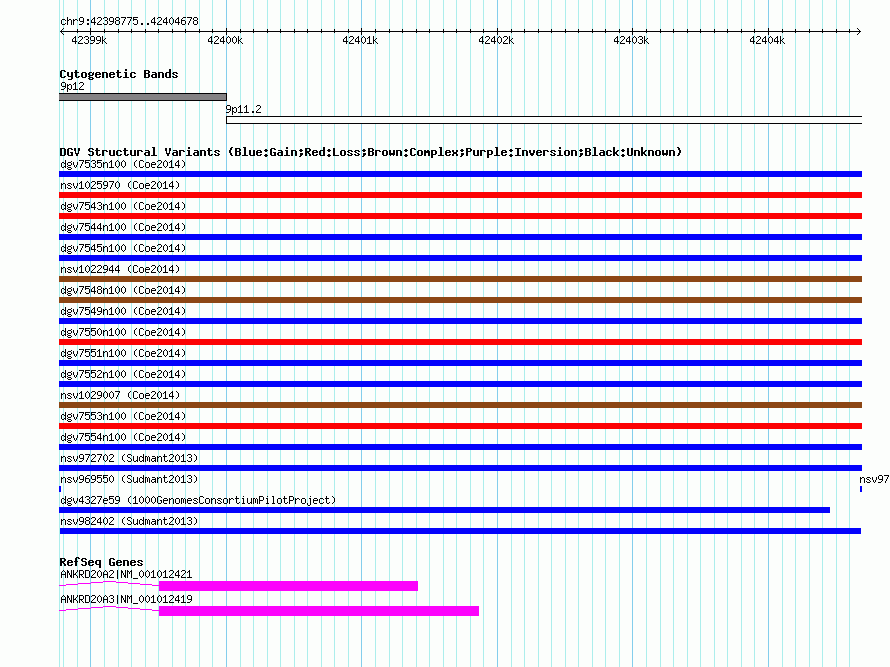 | | Variant Type | CNV duplication | | Copy Number | | | Allele State | | | Allele Origin | | | Probe Count | | | Validation Flag | | | Merged Status | M | | Merged Variants | | | Supporting Variants | nssv2729475, nssv2729413, nssv2729473, nssv2729472, nssv2729412, nssv2729414, nssv2729420, nssv2729415, nssv2729470, nssv2729477, nssv2729478, nssv2729476, nssv2729474, nssv2729411, nssv2729471, nssv2729416, nssv2729469, nssv2729417, nssv2729419, nssv2729418 | | Samples | HGDP01284, HGDP00665, HGDP00998, HGDP00521, HGDP00778, HGDP01307, HGDP00542, HGDP01029, HGDP00456, HGDP00927 | | Known Genes | ANKRD20A2, ANKRD20A3 | | Method | Sequencing | | Analysis | lineage specific fixed expansions | | Platform | Not reported | | Comments | | | Reference | Sudmant_et_al_2013 | | Pubmed ID | 23825009 | | Accession Number(s) | nsv982402
