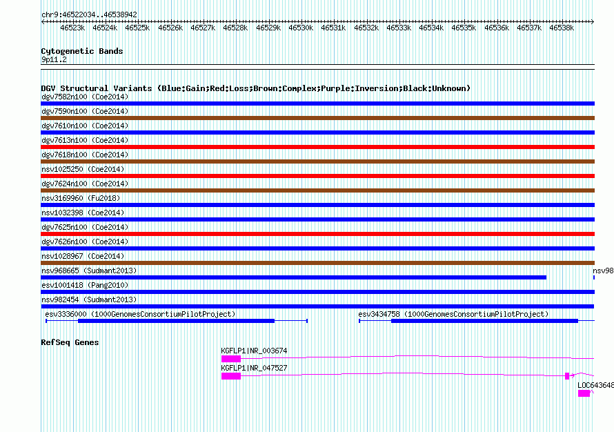 Variant DetailsVariant: nsv982454| Internal ID | 18617649 | | Landmark | | | Location Information | | | Cytoband | 9p11.2 | | Allele length | | Assembly | Allele length | | hg38 | 16909 | | hg19 | 16909 | | hg18 | 16909 |