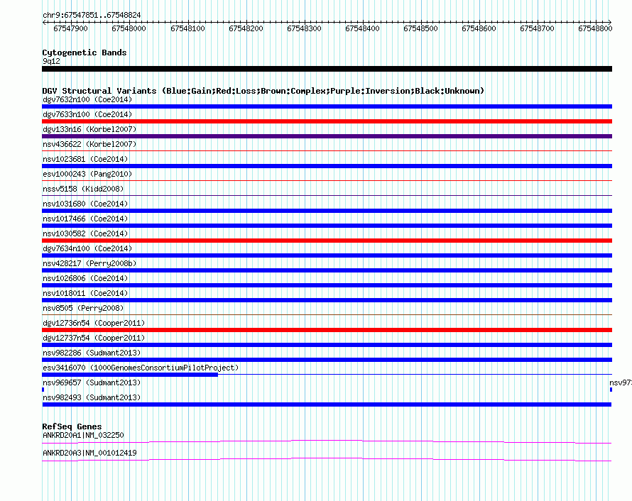 Variant DetailsVariant: nsv982493| Internal ID | 18617688 | | Landmark | | | Location Information | | | Cytoband | 9q12 | | Allele length | | Assembly | Allele length | | hg38 | 974 | | hg19 | 974 | | hg18 | 974 |
