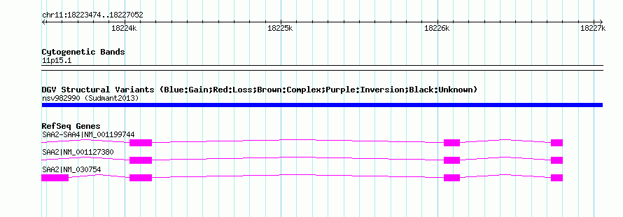 Variant DetailsVariant: nsv982990| Internal ID | 18618184 | | Landmark | | | Location Information | | | Cytoband | 11p15.1 | | Allele length | | Assembly | Allele length | | hg38 | 3579 | | hg19 | 3579 | | hg18 | 3579 |
