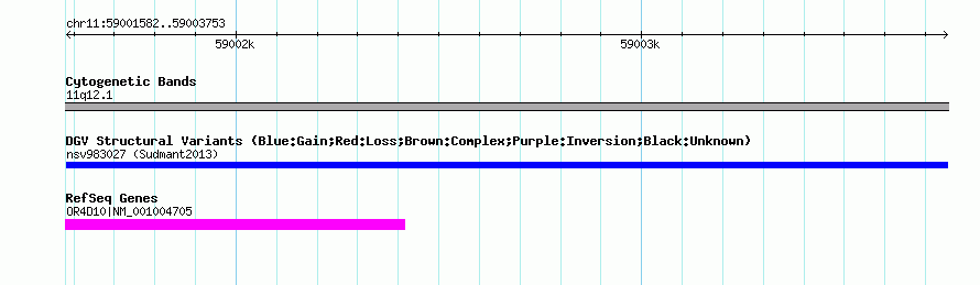 Variant DetailsVariant: nsv983027| Internal ID | 18271535 | | Landmark | | | Location Information | | | Cytoband | 11q12.1 | | Allele length | | Assembly | Allele length | | hg38 | 2172 | | hg19 | 2172 | | hg18 | 2172 |