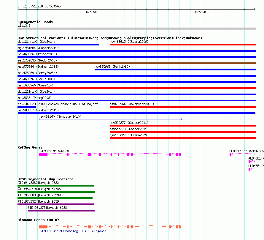 Variant DetailsVariant: nsv983037| Internal ID | 18271545 | | Landmark | | | Location Information | | | Cytoband | 11q13.2 | | Allele length | | Assembly | Allele length | | hg38 | 21749 | | hg19 | 21748 | | hg18 | 21748 |
