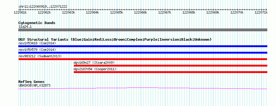 Variant DetailsVariant: nsv983212| Internal ID | 18618406 | | Landmark | | | Location Information | | | Cytoband | 11q24.1 | | Allele length | | Assembly | Allele length | | hg38 | 10304 | | hg19 | 10304 | | hg18 | 10304 |