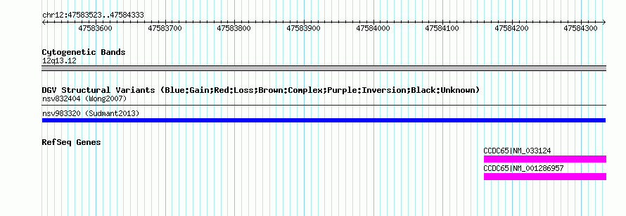 Variant DetailsVariant: nsv983320| Internal ID | 18618514 | | Landmark | | | Location Information | | | Cytoband | 12q13.12 | | Allele length | | Assembly | Allele length | | hg38 | 811 | | hg19 | 811 | | hg18 | 811 |