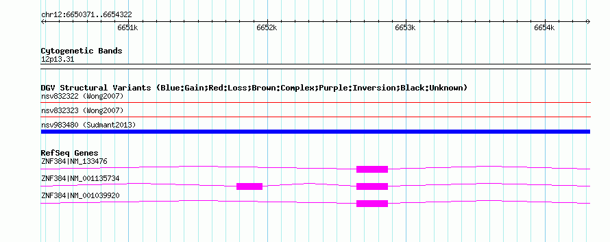 Variant DetailsVariant: nsv983480| Internal ID | 18271988 | | Landmark | | | Location Information | | | Cytoband | 12p13.31 | | Allele length | | Assembly | Allele length | | hg38 | 3952 | | hg19 | 3952 | | hg18 | 3952 |