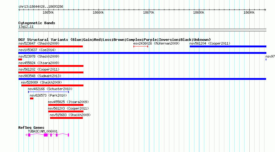 Variant DetailsVariant: nsv983548| Internal ID | 18618741 | | Landmark | | | Location Information | | | Cytoband | 13q12.11 | | Allele length | | Assembly | Allele length | | hg38 | 49261 | | hg19 | 49261 | | hg18 | 49261 |