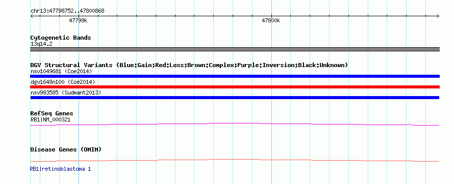 Variant DetailsVariant: nsv983585| Internal ID | 18618778 | | Landmark | | | Location Information | | | Cytoband | 13q14.2 | | Allele length | | Assembly | Allele length | | hg38 | 2117 | | hg19 | 2117 | | hg18 | 2117 |
