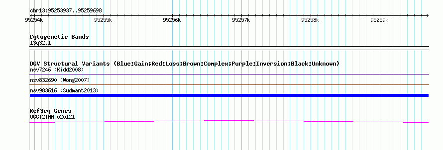 Variant DetailsVariant: nsv983616| Internal ID | 18618809 | | Landmark | | | Location Information | | | Cytoband | 13q32.1 | | Allele length | | Assembly | Allele length | | hg38 | 5762 | | hg19 | 5762 | | hg18 | 5762 |