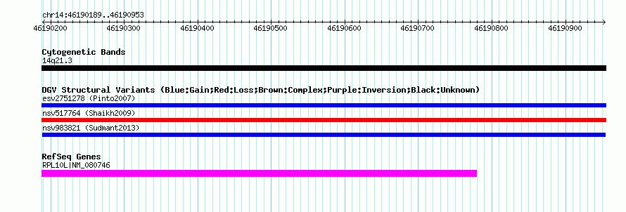 Variant DetailsVariant: nsv983821| Internal ID | 18619013 | | Landmark | | | Location Information | | | Cytoband | 14q21.2 | | Allele length | | Assembly | Allele length | | hg38 | 765 | | hg19 | 765 | | hg18 | 765 |