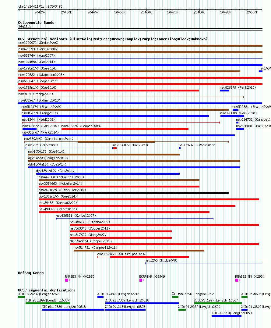 | Variant Type | CNV duplication | Copy Number | | Allele State | | Allele Origin | | Probe Count | | Validation Flag | | Merged Status | M | Merged Variants | | Supporting Variants | nssv2761102, nssv2766407, nssv2757820, nssv2761944, nssv2764422, nssv2759979, nssv2759520, nssv2759223 | Samples | HGDP01284, HGDP00665, HGDP00998, HGDP00521, HGDP01307, HGDP00542, HGDP01029, HGDP00927 | Known Genes | ECRP, RNASE2, RNASE3 | Method | Sequencing | Analysis | Human CNVs | Platform | Not reported | Comments | | Reference | Sudmant_et_al_2013 | Pubmed ID | 23825009 | Accession Number(s) | nsv983967