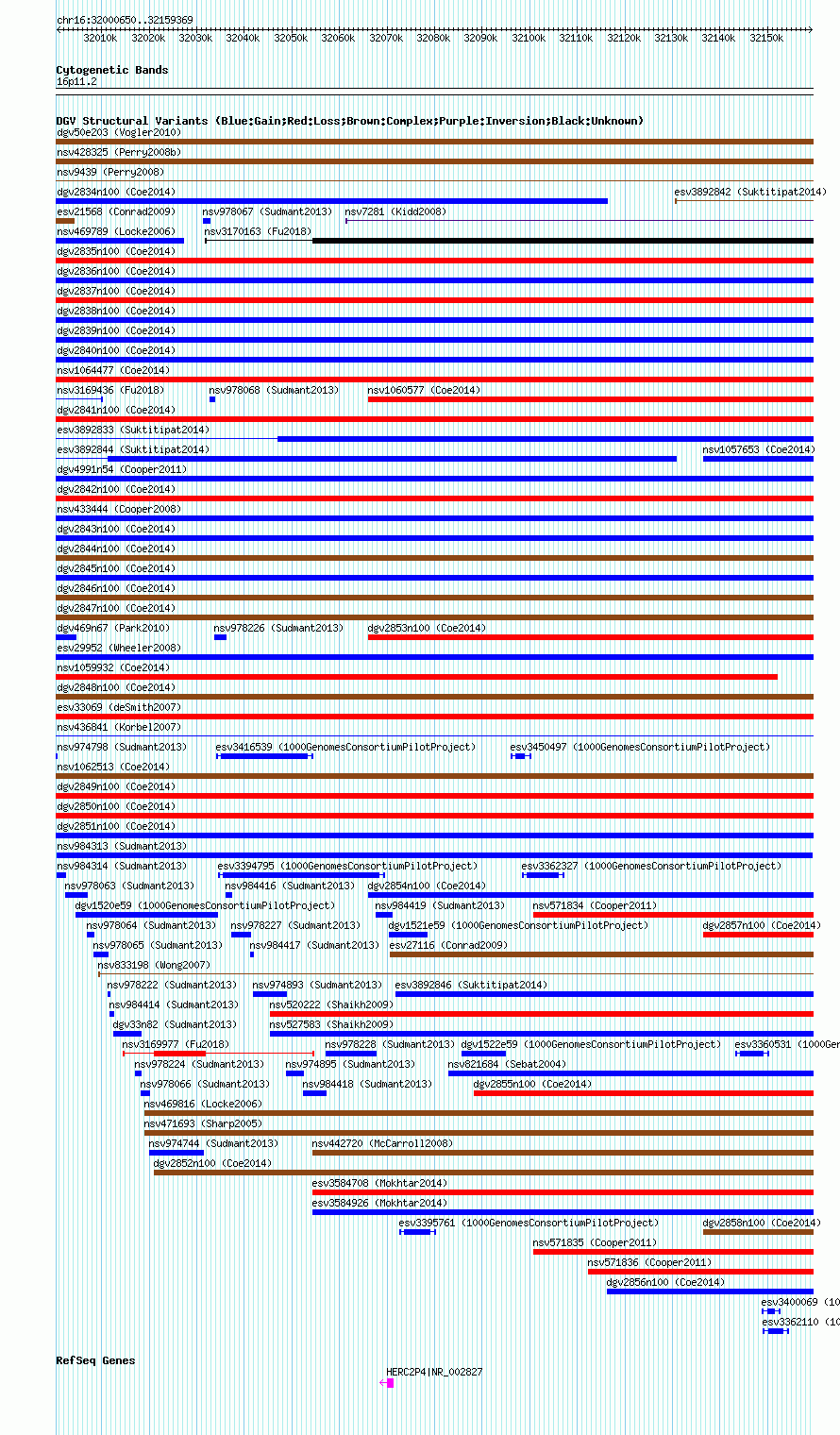 Variant DetailsVariant: nsv984313| Internal ID | 18619501 | | Landmark | | | Location Information | | | Cytoband | 16p11.2 | | Allele length | | Assembly | Allele length | | hg38 | 158720 | | hg19 | 158720 | | hg18 | 158720 |