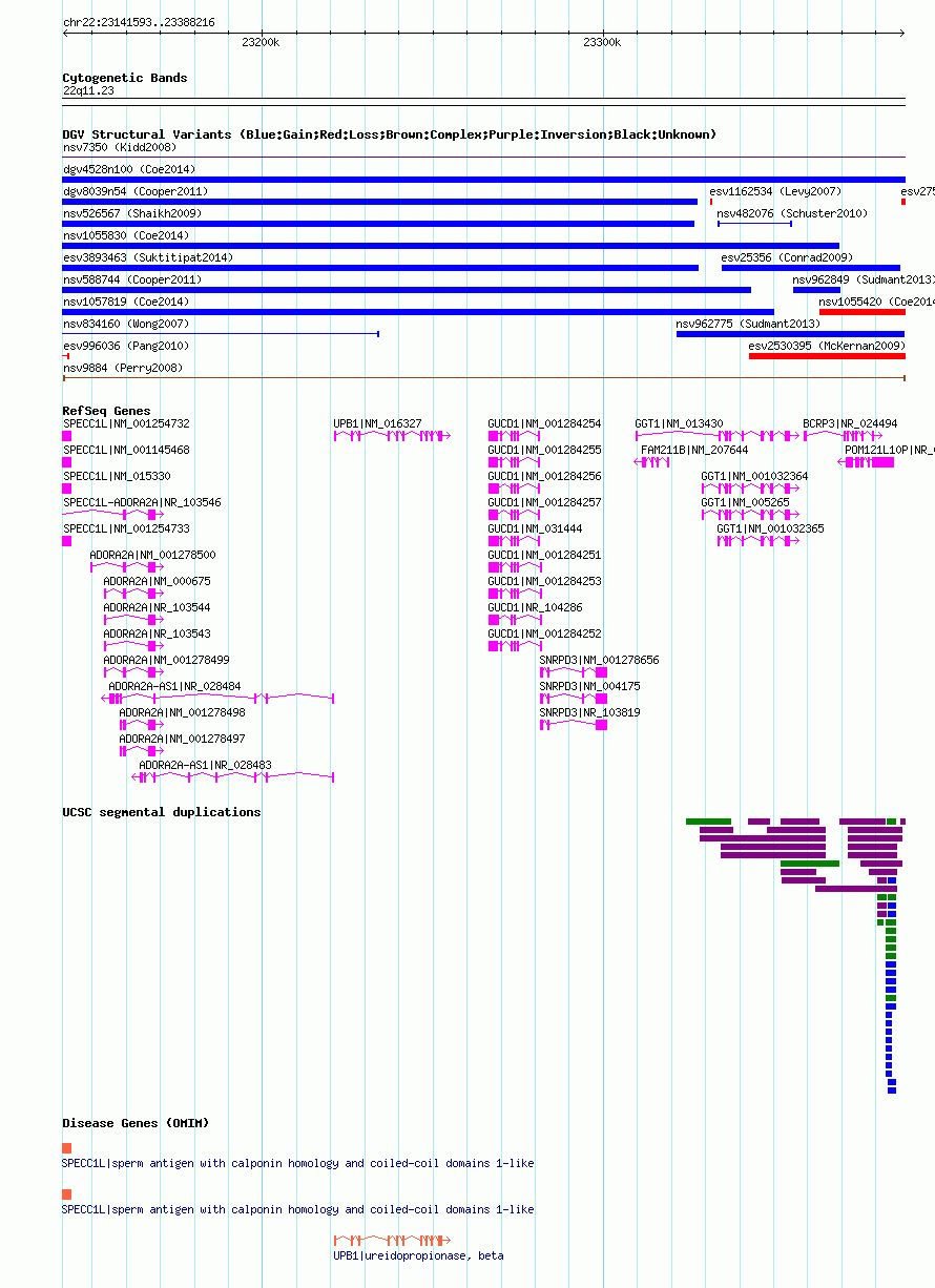 | Variant Type | CNV gain+loss | Copy Number | | Allele State | | Allele Origin | | Probe Count | | Validation Flag | | Merged Status | M | Merged Variants | | Supporting Variants | nssv28128, nssv26536, nssv27810, nssv28761, nssv27353, nssv27874 | Samples | NA12155, NA18860, NA19221, NA18537, NA19132, NA18972 | Known Genes | ADORA2A, ADORA2A-AS1, BCRP3, FAM211B, GGT1, GUCD1, POM121L10P, SNRPD3, SPECC1L, SPECC1L-ADORA2A, UPB1 | Method | Oligo aCGH | Analysis | Statistical threshold = 5.0, minimum +/- log2 ratio = 0.25 and minimum number of probes = 2 | Platform | Agilent-015686 Custom Human 244K CGH Microarray | Comments | | Reference | Perry_et_al_2008 | Pubmed ID | 18304495 | Accession Number(s) | nsv9884