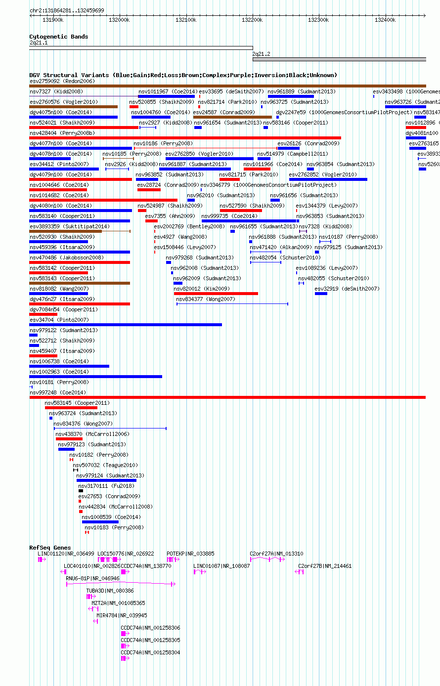 Variant DetailsVariant: nsv997248| Internal ID | 19156786 | | Landmark | | | Location Information | | | Cytoband | 2q21.1 | | Allele length | | Assembly | Allele length | | hg38 | 595419 | | hg19 | 595419 | | hg18 | 595419 |